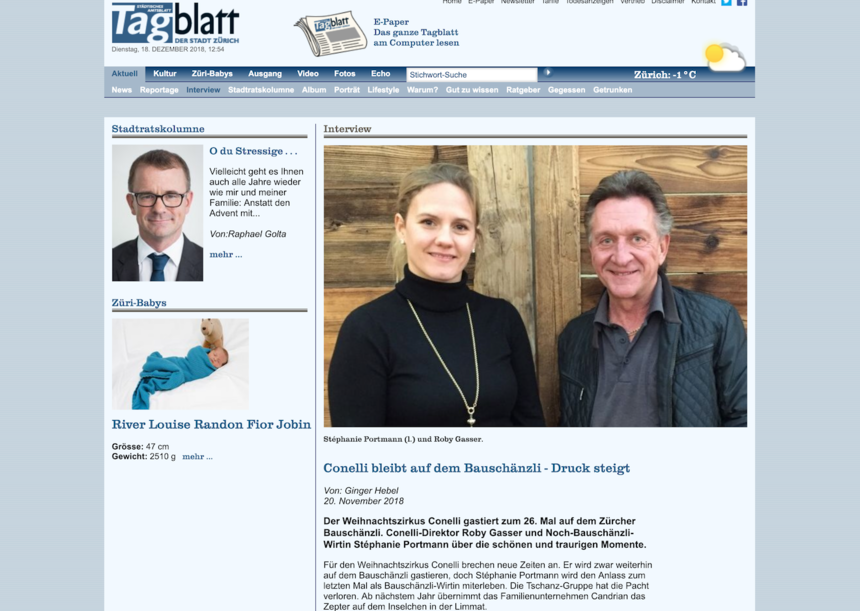 Der Weihnachtszirkus Conelli gastiert zum 26. Mal auf dem Zürcher Bauschänzli. Conelli-Direktor Roby Gasser und Noch-Bauschänzli-Wirtin Stéphanie Portmann über die schönen und traurigen Momente.